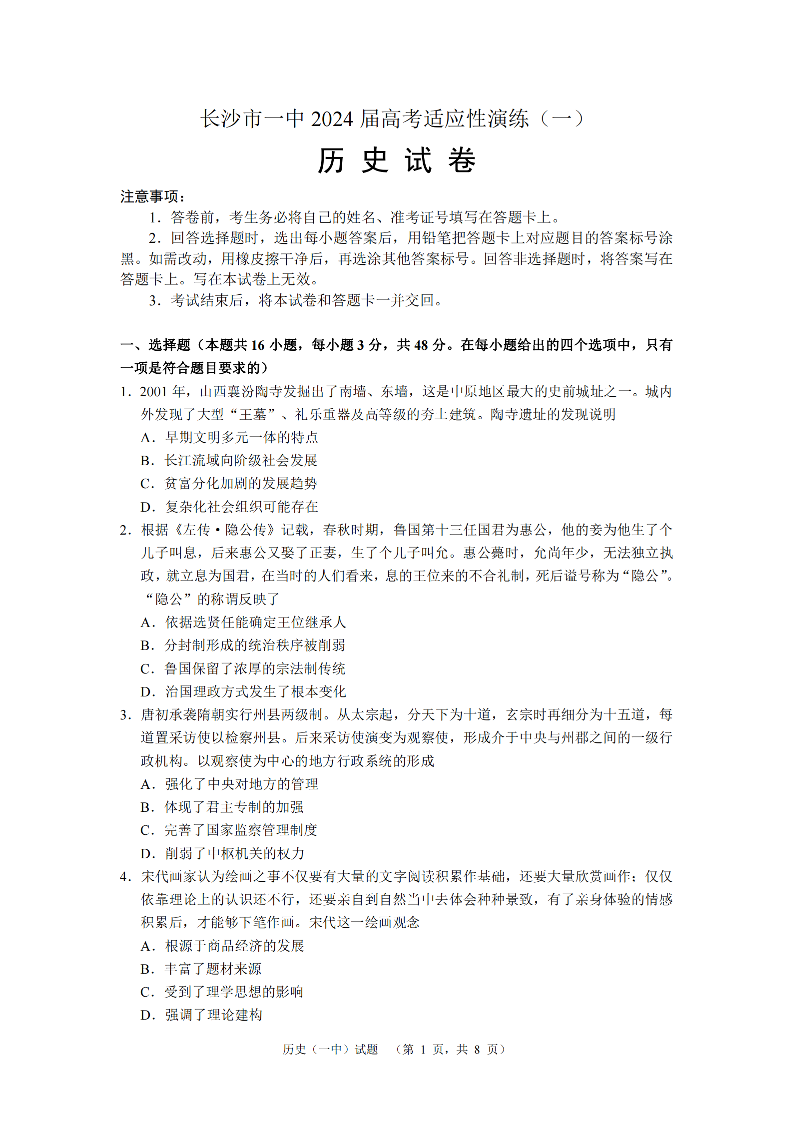 2024届湖南省长沙市第一中高三下学期高考适应性演练(一)历史
