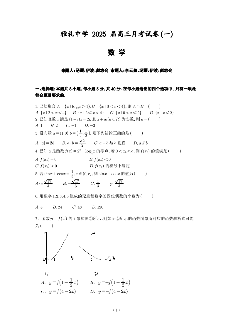 湖南省雅礼中学2025届高三月考试卷(一)数学