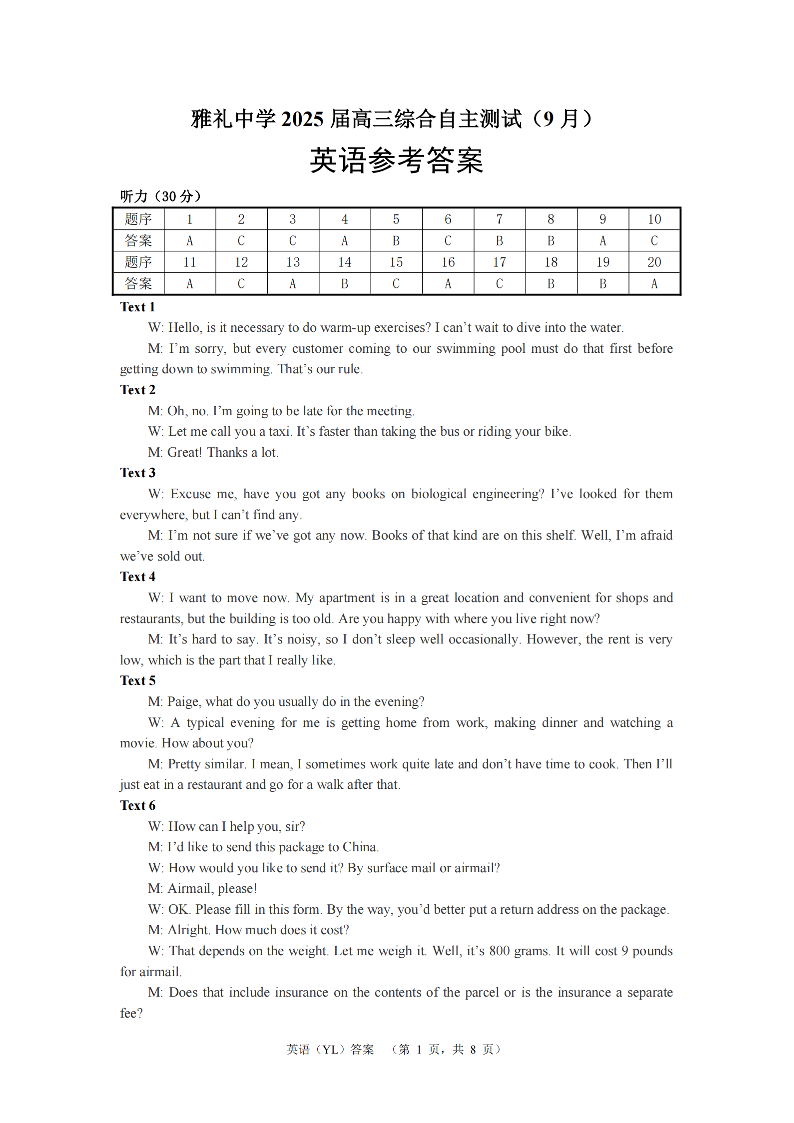 湖南省雅礼中学2025届高三综合自主测试(9月)+英语答案