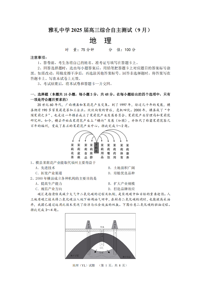湖南省雅礼中学2025届高三综合自主测试(9月)+地理
