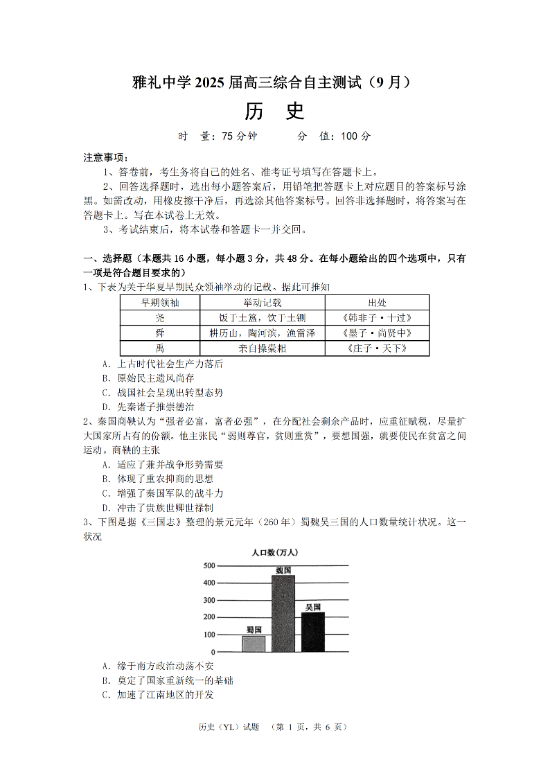 湖南省雅礼中学2025届高三综合自主测试(9月)+历史