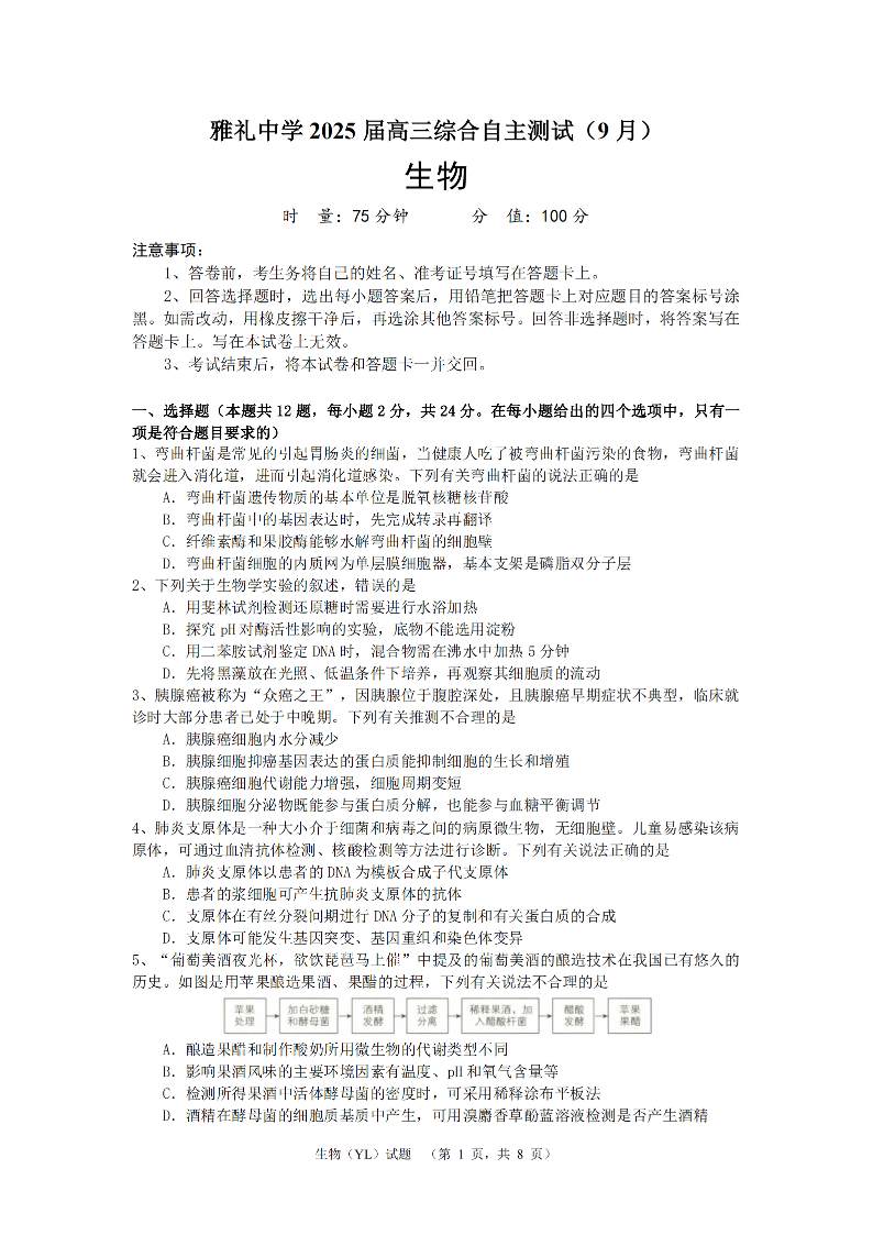 湖南省雅礼中学2025届高三综合自主测试(9月)+生物