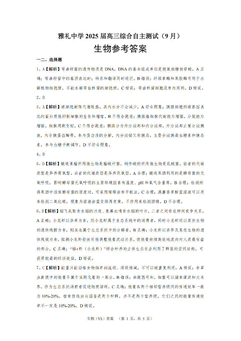湖南省雅礼中学2025届高三综合自主测试(9月)+生物答案