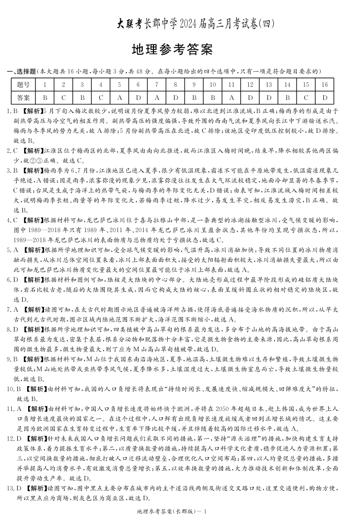 湖南省长沙市长郡中学2023-2024学年高三上学期月考(四)地理答案