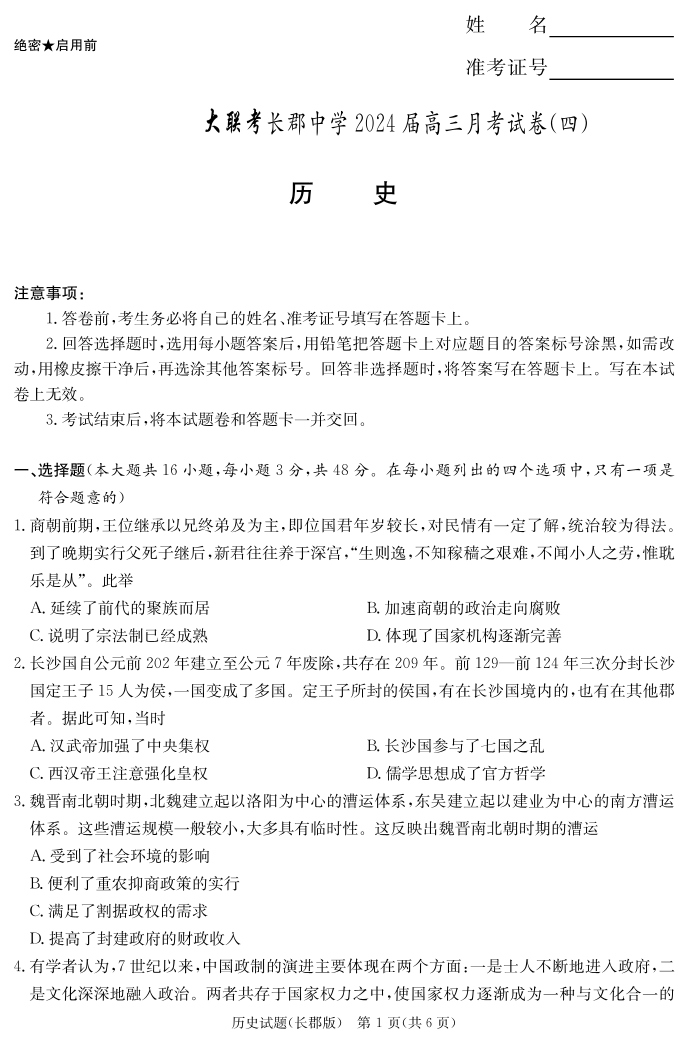 湖南省长沙市长郡中学2023-2024学年高三上学期月考(四)历史
