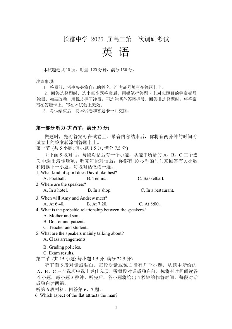 湖南省长郡中学2025届高三第一次调研考试+英语