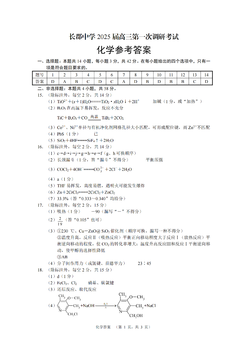 湖南省长郡中学2025届高三第一次调研考试+化学答案