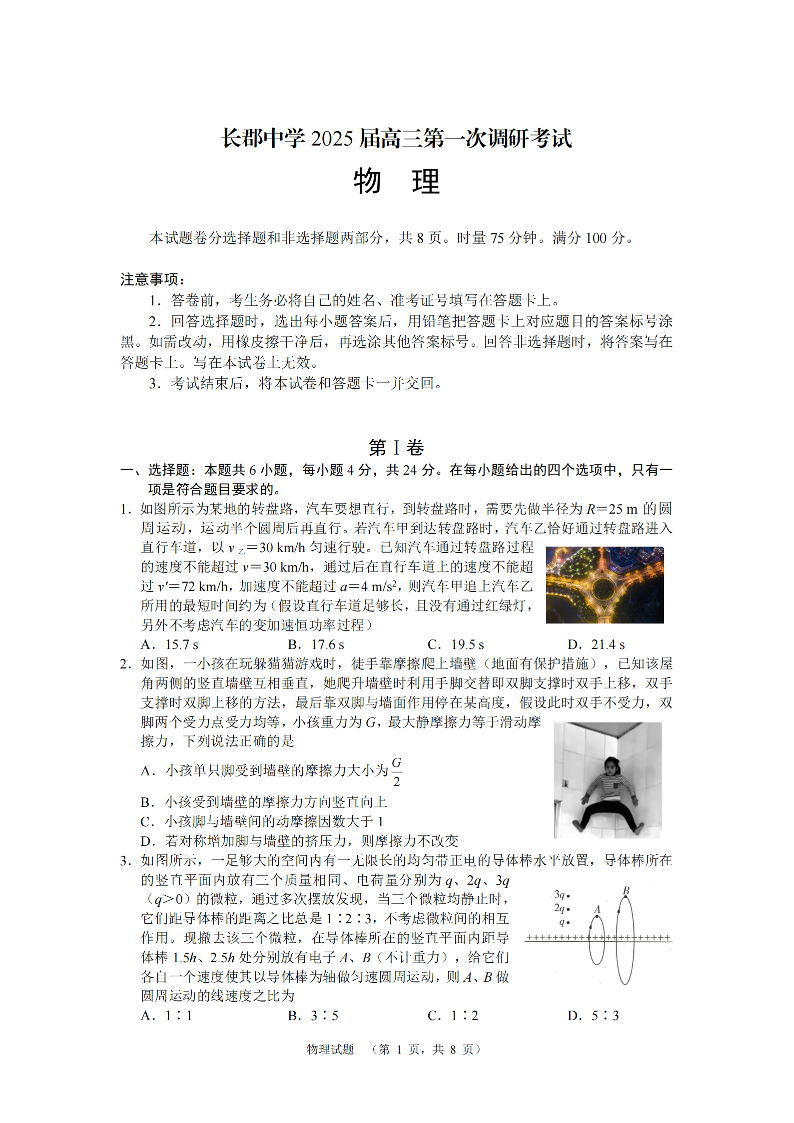 湖南省长郡中学2025届高三第一次调研考试+物理
