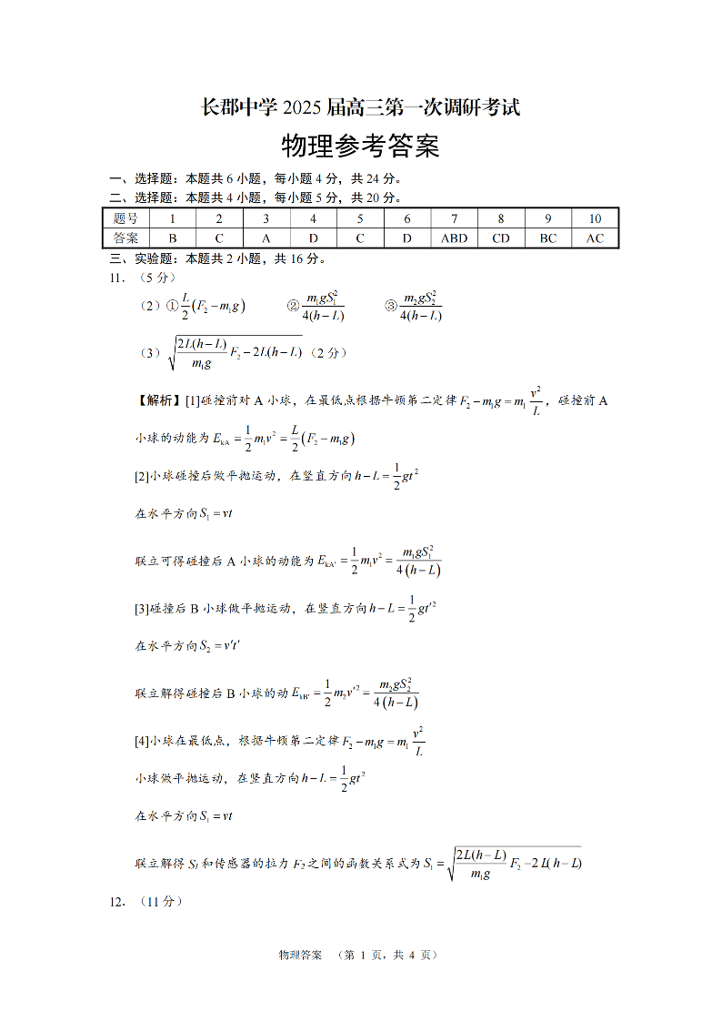 湖南省长郡中学2025届高三第一次调研考试+物理答案
