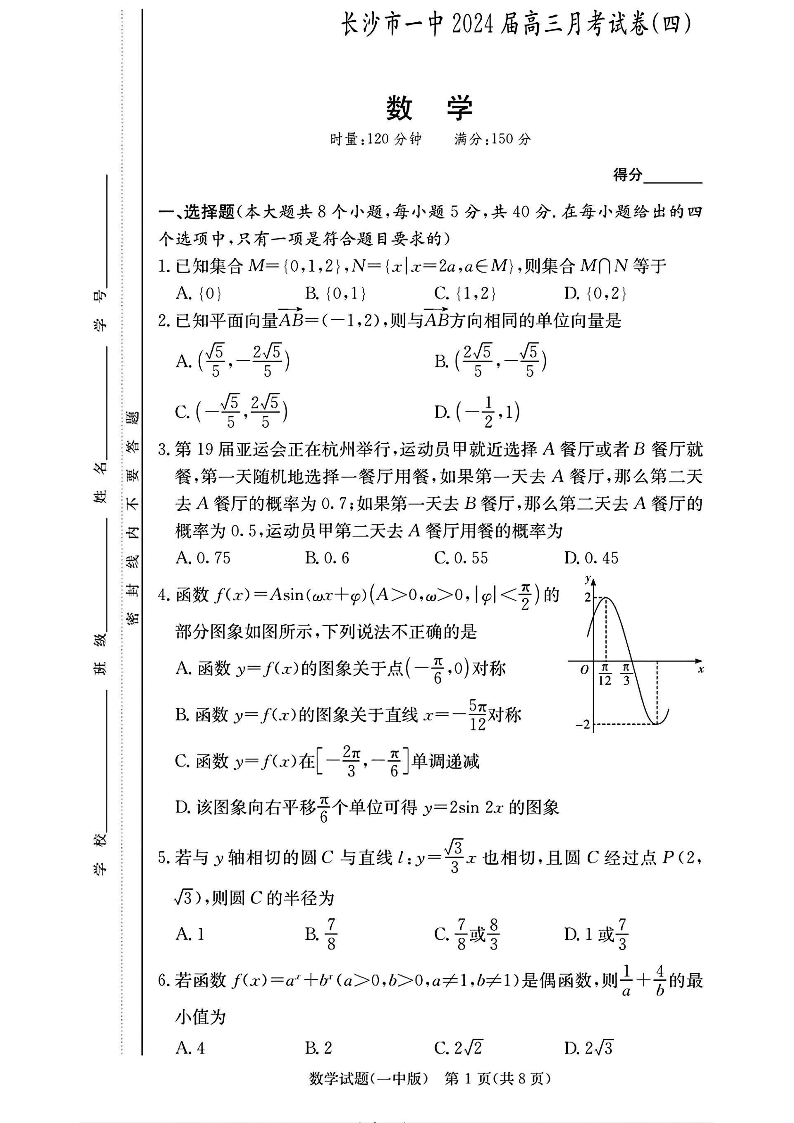 湖南省长沙市第一中学2023-2024学年高三上学期月考卷(四)数学