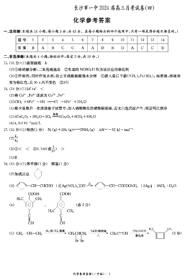 湖南省长沙市第一中学2023-2024学年高三上学期月考卷(四)化学答案