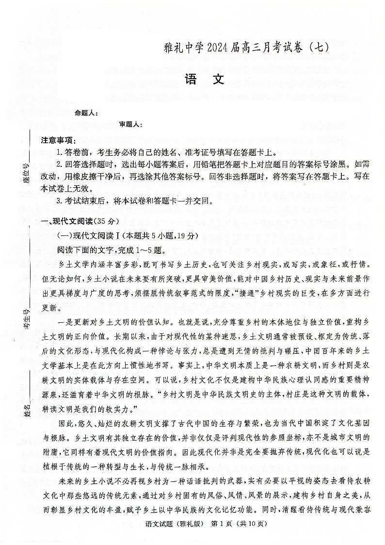 湖南省长沙市雅礼中学2023-2024学年高三下学期月考(七)语文