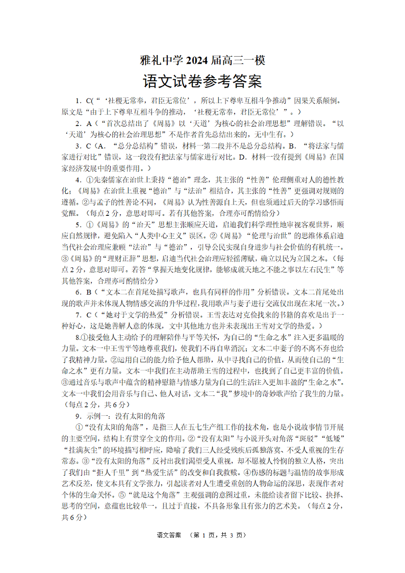 湖南省长沙市雅礼中学2024届高三一模 语文答案