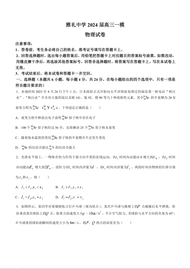 湖南省长沙市雅礼中学2024届高三一模 物理