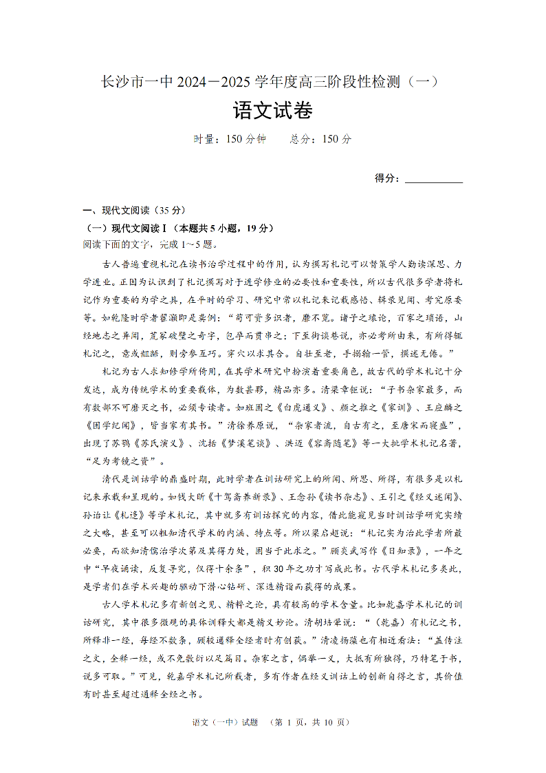 湖南省长沙市一中2024-2025学年高三阶段性检测(一)语文