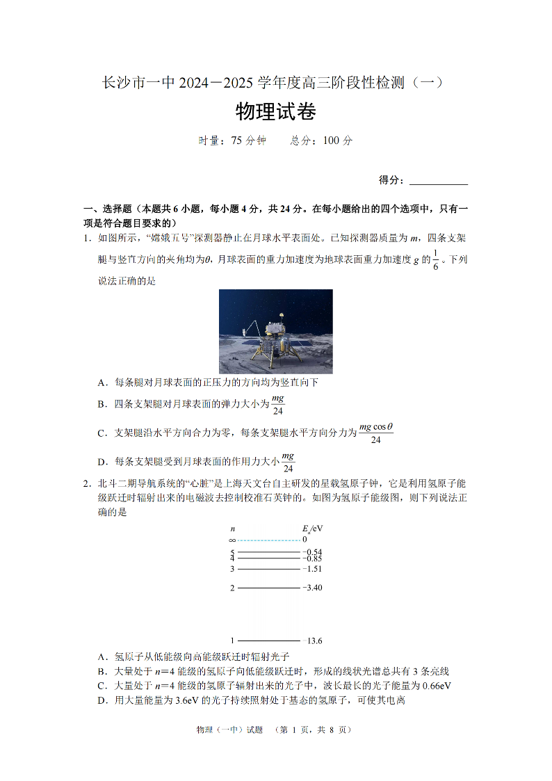 湖南省长沙市一中2024-2025学年高三阶段性检测(一)物理