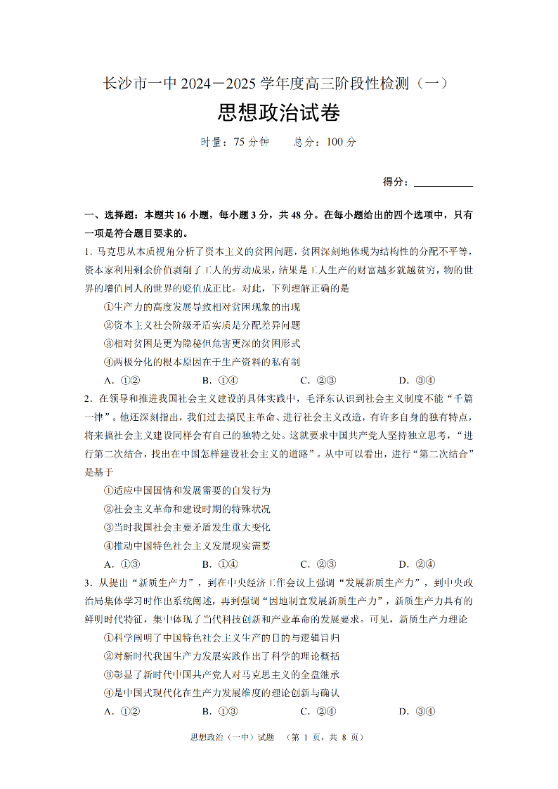 湖南省长沙市一中2024-2025学年高三阶段性检测(一)政治
