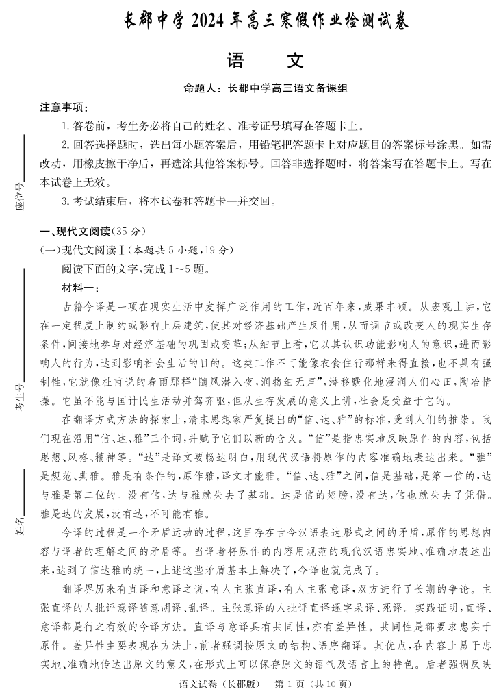 湖南省长沙市长郡中学2023-2024学年高三下学期寒假作业检测(月考六)语文