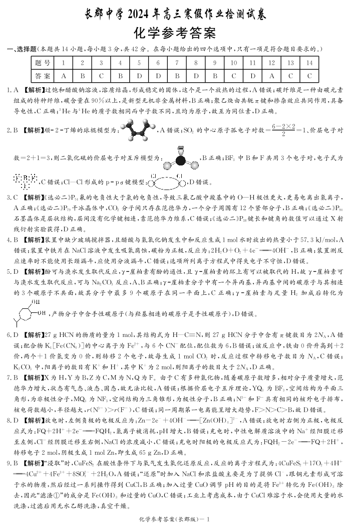 湖南省长沙市长郡中学2023-2024学年高三下学期寒假作业检测(月考六)化学答案