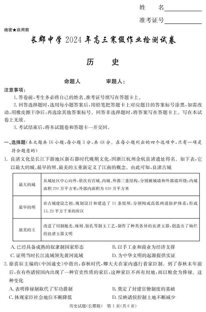湖南省长沙市长郡中学2023-2024学年高三下学期寒假作业检测(月考六)历史