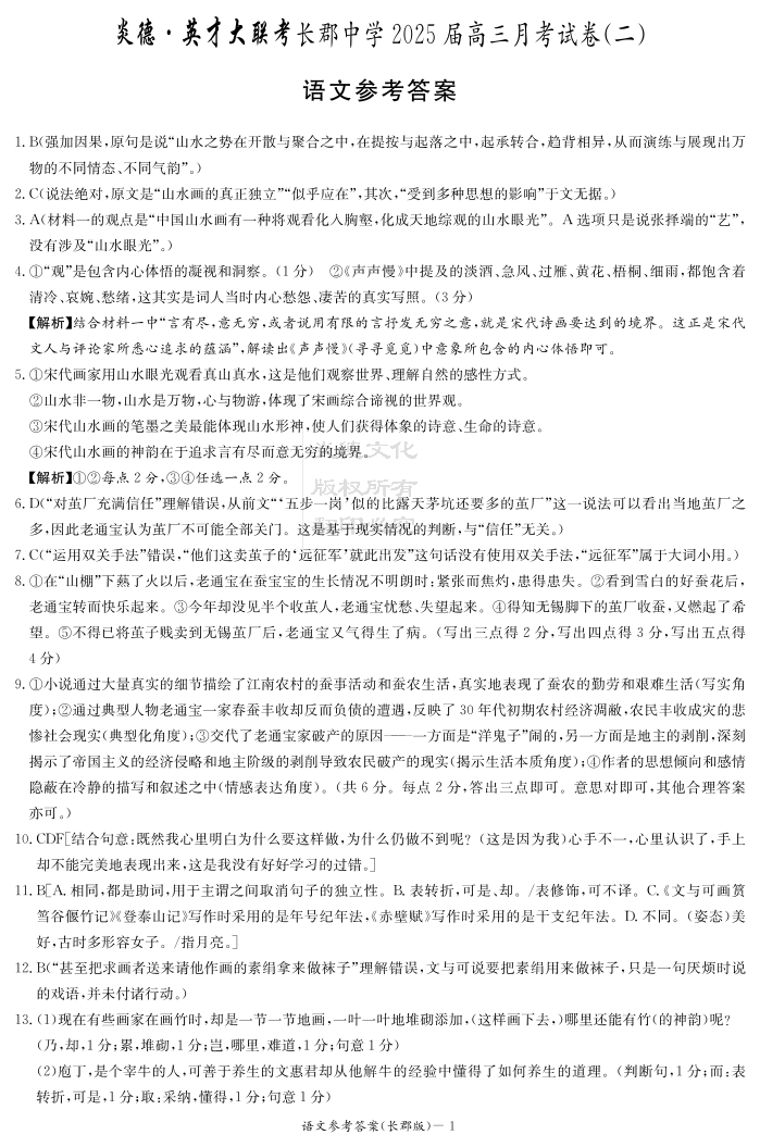 湖南省长沙市长郡中学2025届高三上学期月考(二)语文答案