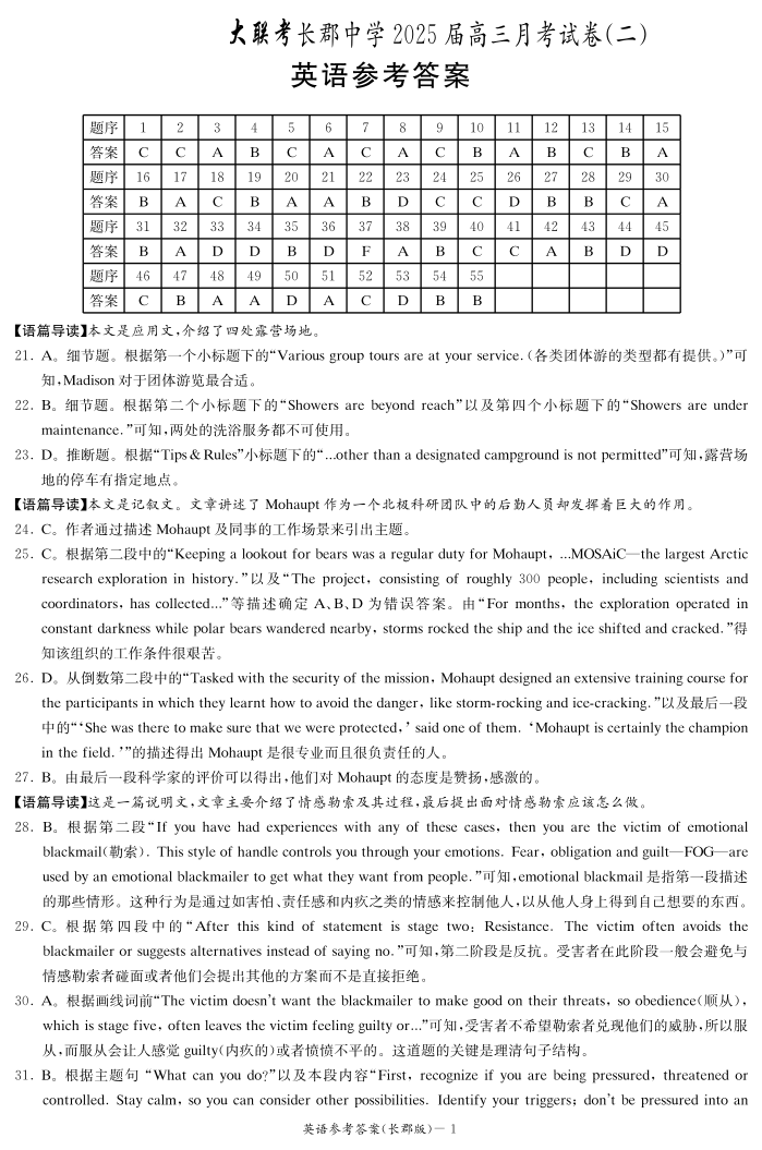湖南省长沙市长郡中学2025届高三上学期月考(二)英语答案