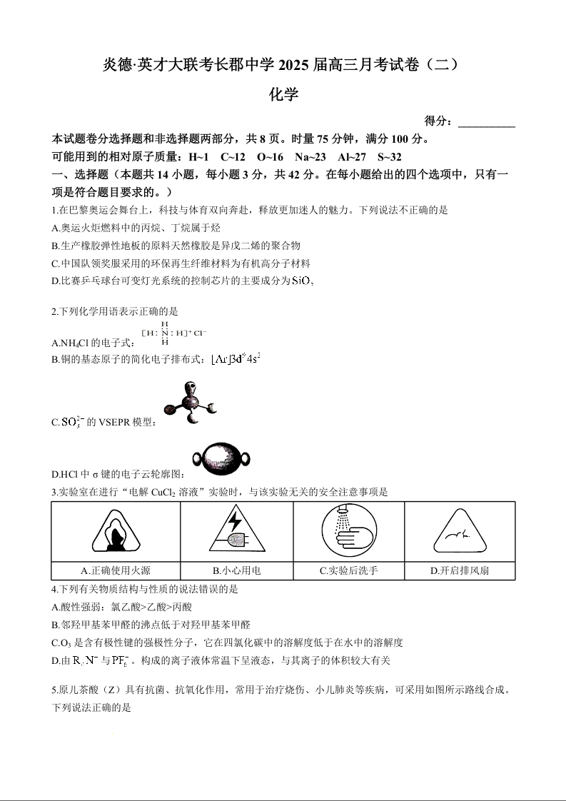 湖南省长沙市长郡中学2025届高三上学期月考(二)化学