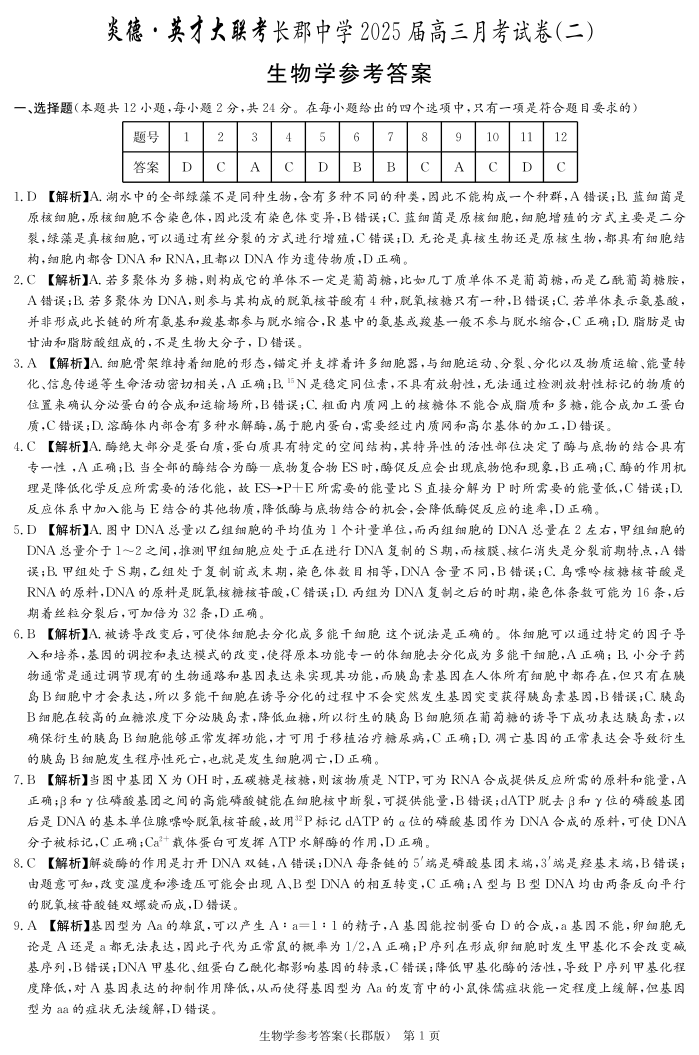 湖南省长沙市长郡中学2025届高三上学期月考(二)生物答案
