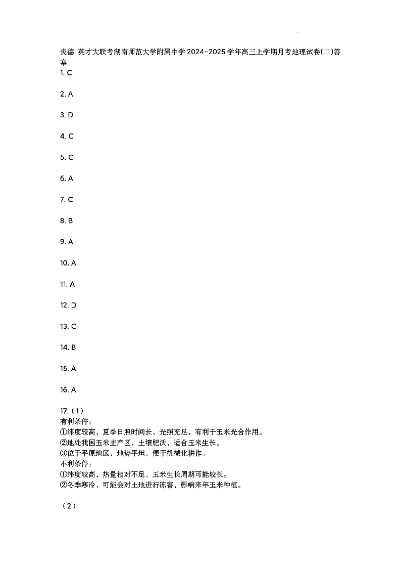 湖南师大附中2025届高三月考试卷(二)+地理答案