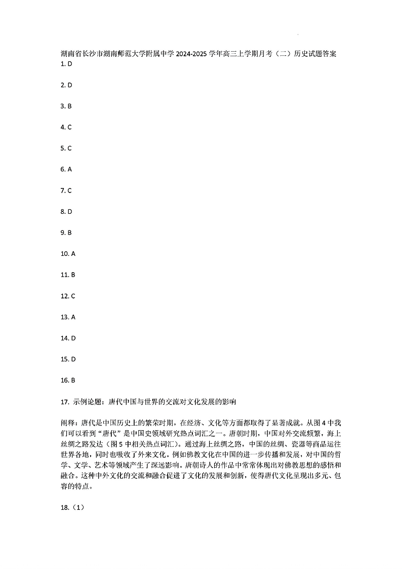 湖南师大附中2025届高三月考试卷(二)+历史答案