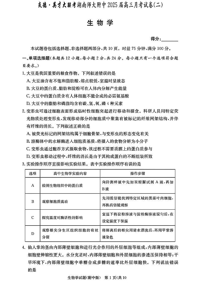 湖南师大附中2025届高三月考试卷(二)+生物