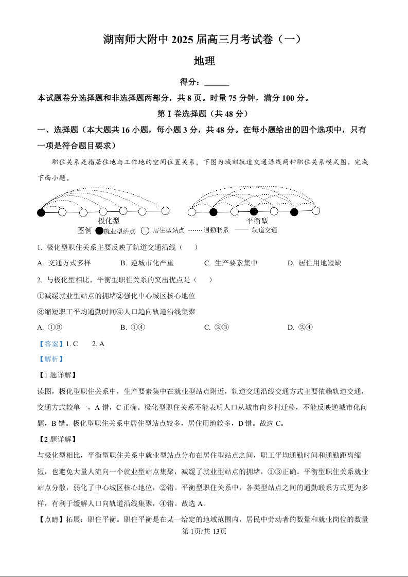 湖南师大附中2025届高三月考试卷(一)地理答案