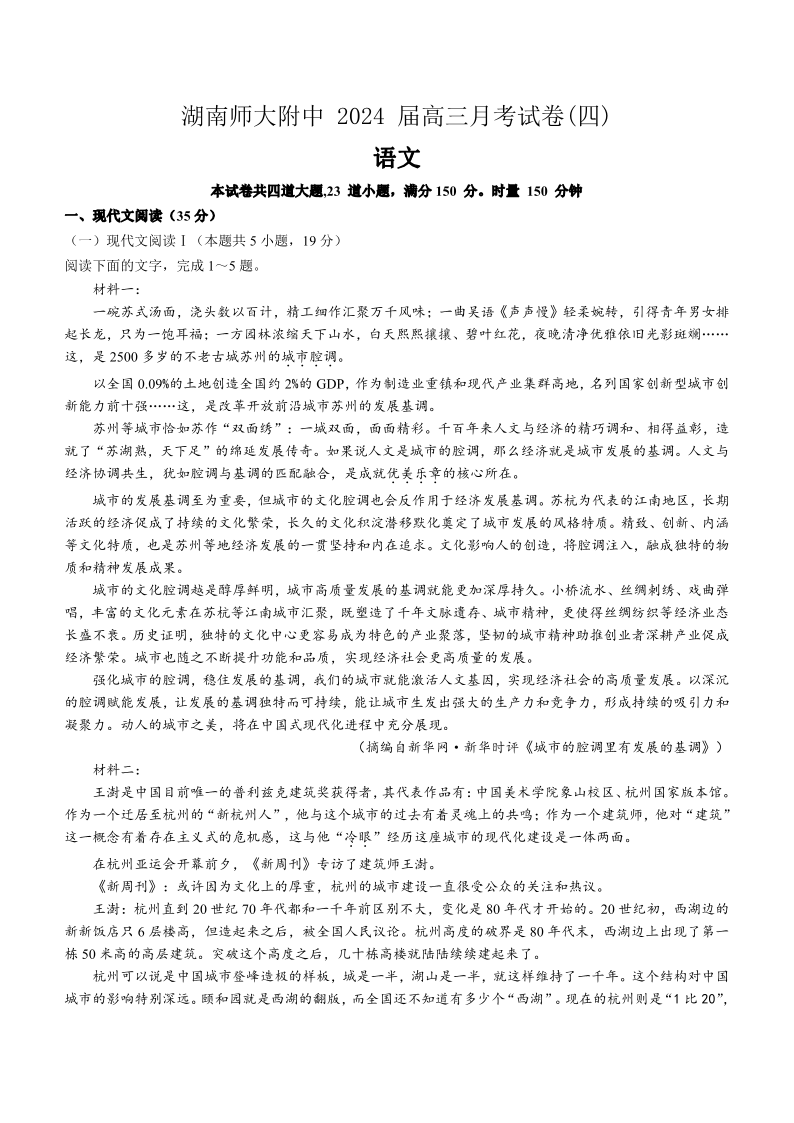 湖南师范大学附属中学2023-2024学年高三上学期月考卷(四)语文