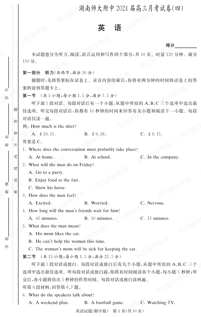 湖南师范大学附属中学2023-2024学年高三上学期月考卷(四)英语