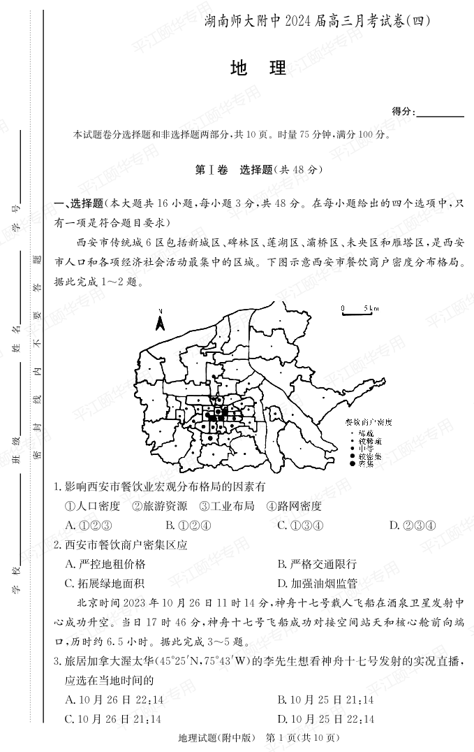 湖南师范大学附属中学2023-2024学年高三上学期月考卷(四)地理