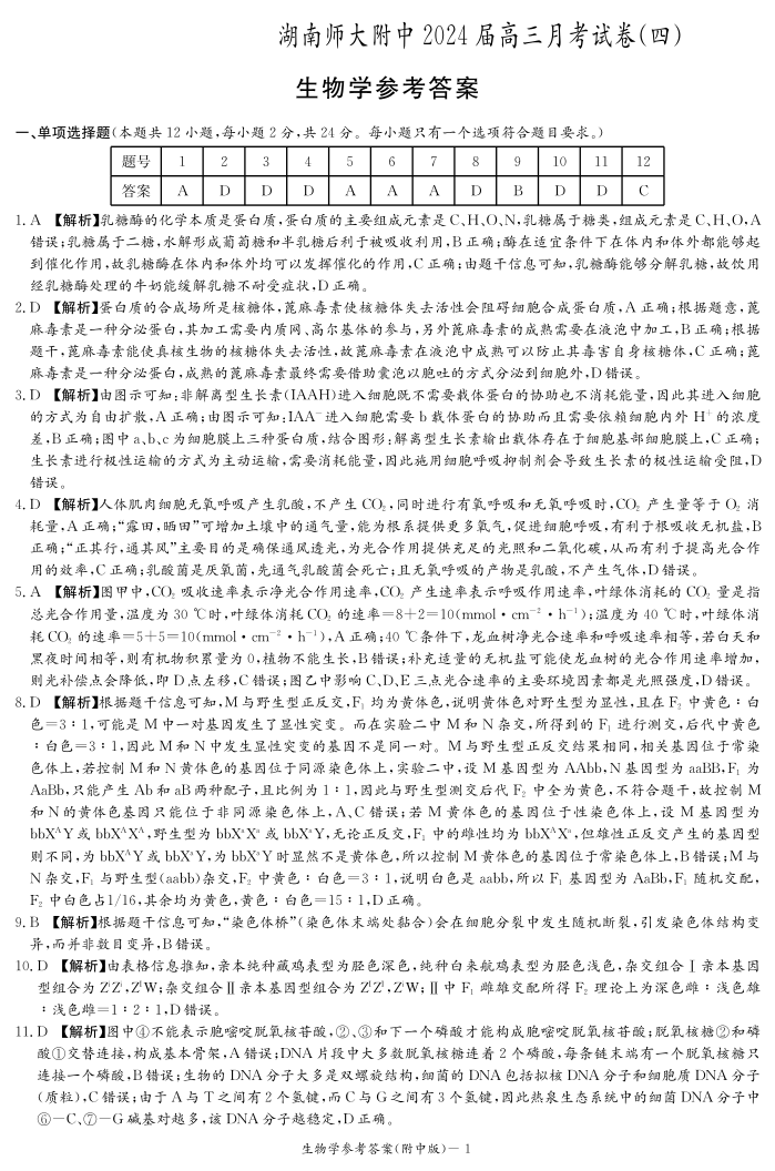湖南师范大学附属中学2023-2024学年高三上学期月考卷(四)生物答案