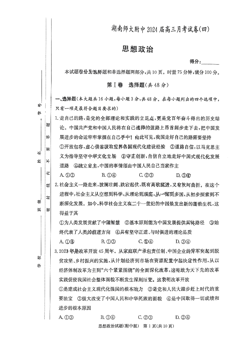 湖南师范大学附属中学2023-2024学年高三上学期月考卷(四)政治