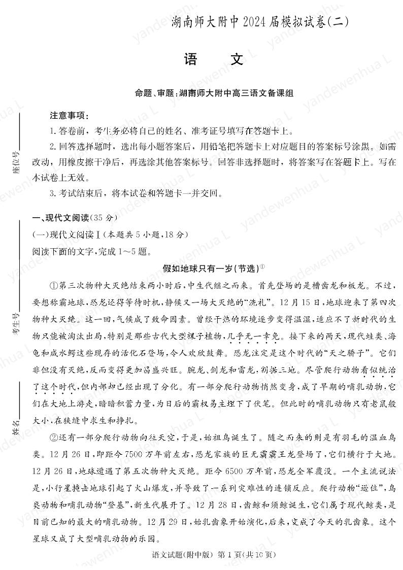 2024届湖南师范大学附属中学高三下学期模拟(二)语文