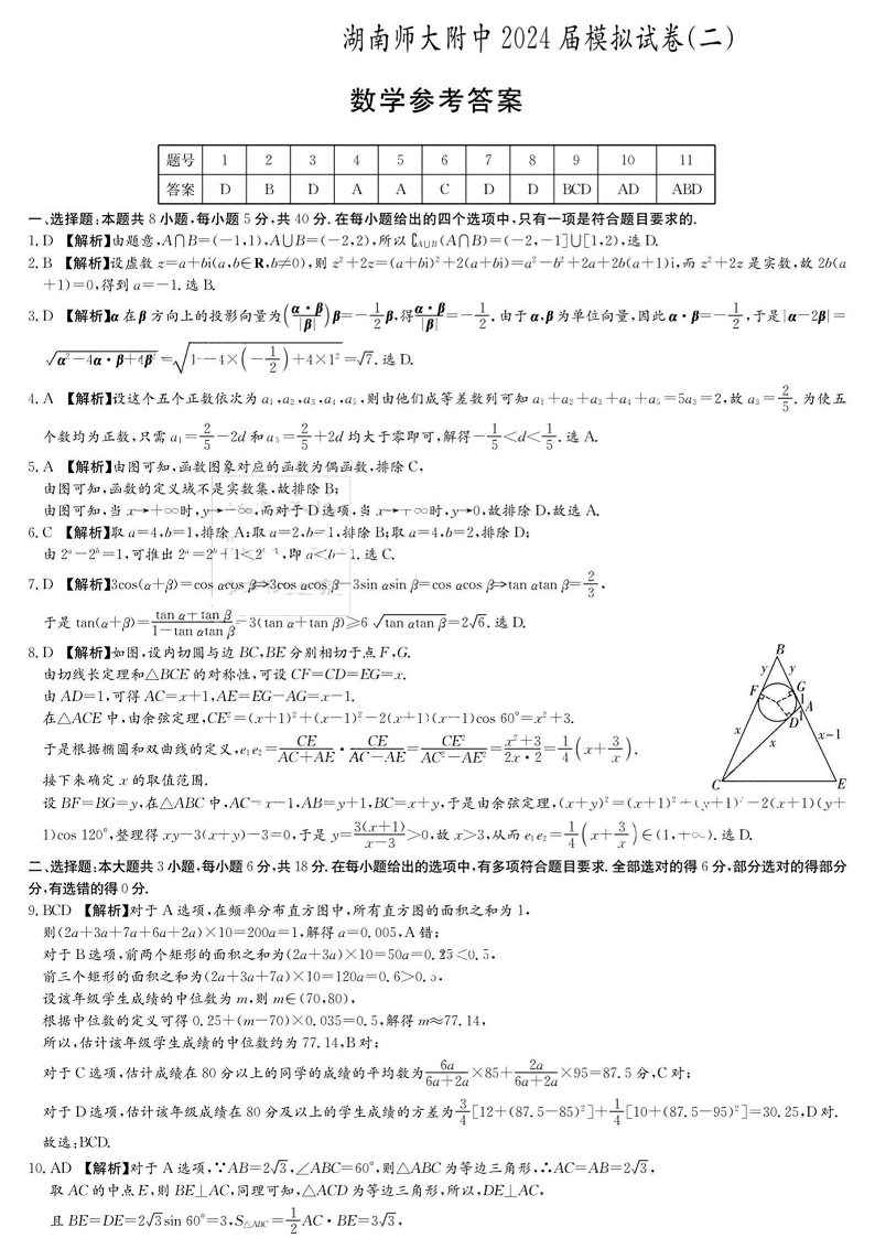 2024届湖南师范大学附属中学高三下学期模拟(二)数学答案