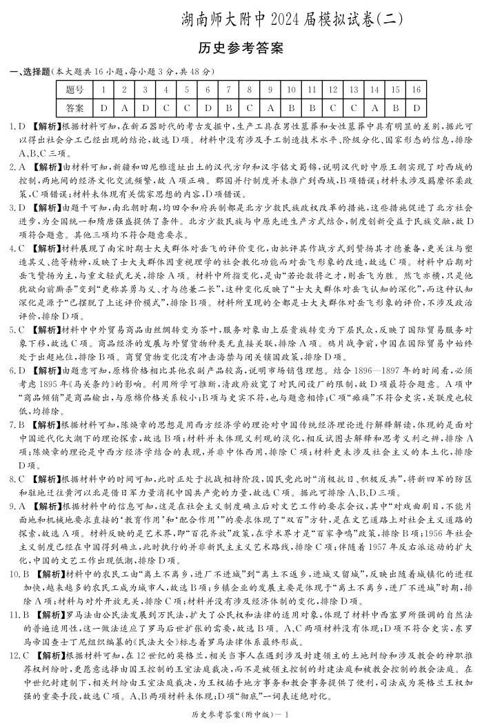 2024届湖南师范大学附属中学高三下学期模拟(二)历史答案
