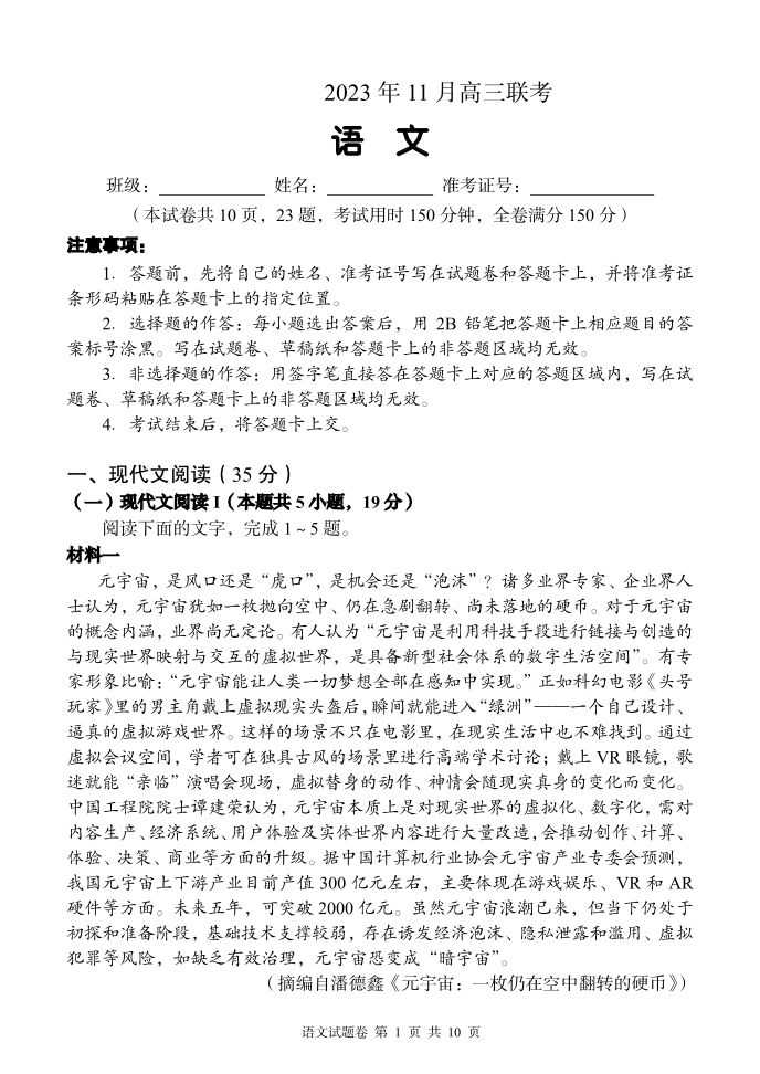 湖南省A佳教育2023-2024学年高三上学期11月联考 语文