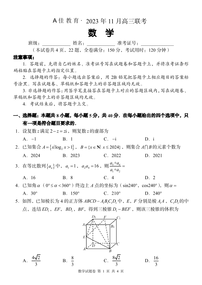 湖南省A佳教育2023-2024学年高三上学期11月联考 数学