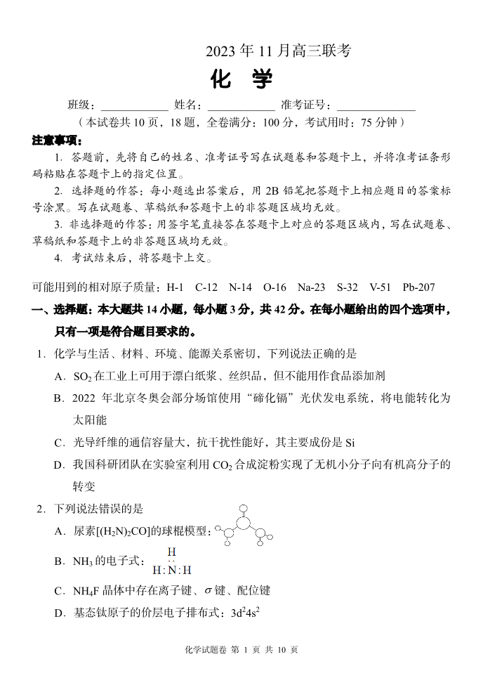 湖南省A佳教育2023-2024学年高三上学期11月联考 化学