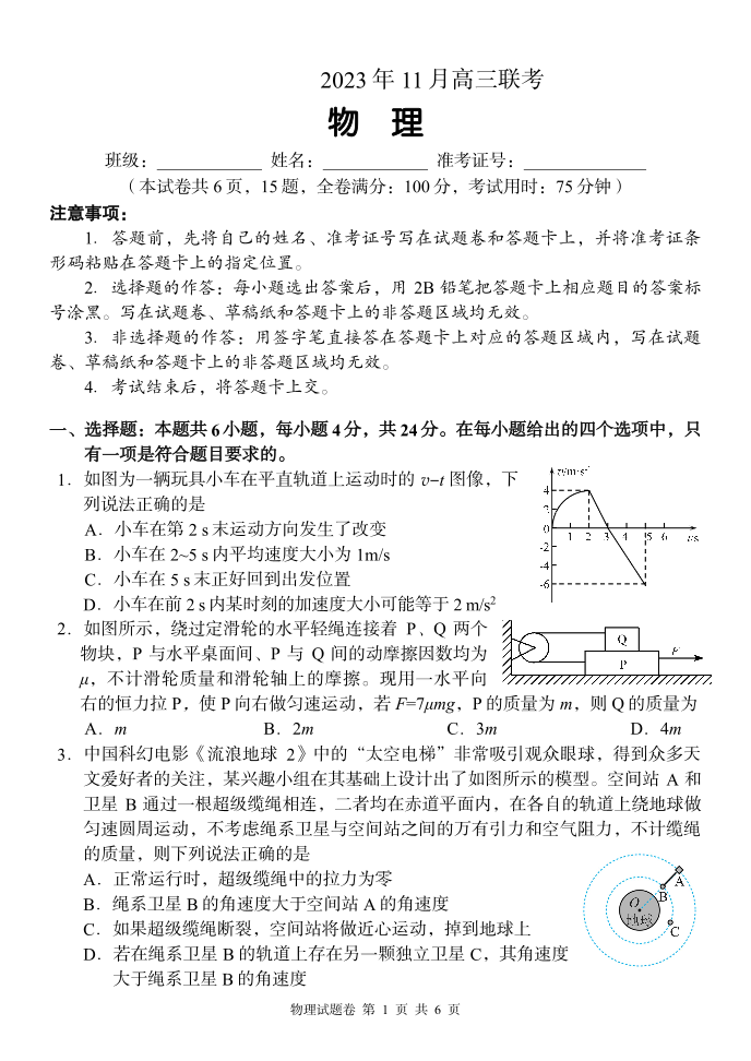 湖南省A佳教育2023-2024学年高三上学期11月联考 物理
