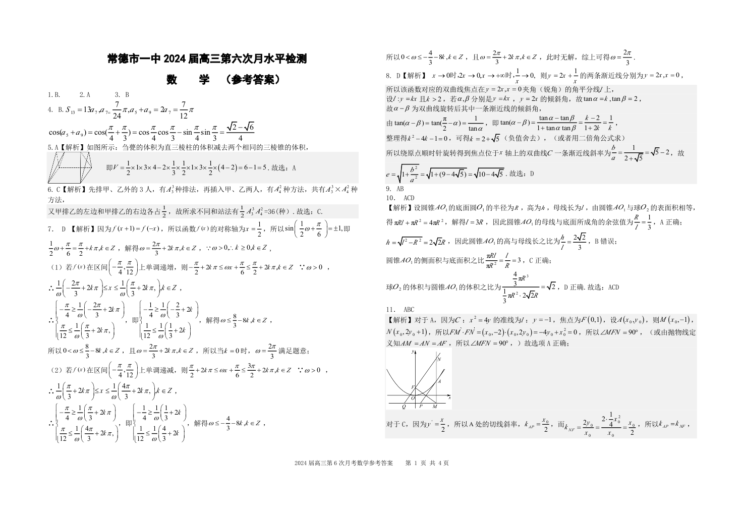 湖南省常德市第一中学2023-2024学年高三上学期第六次月考 数学答案