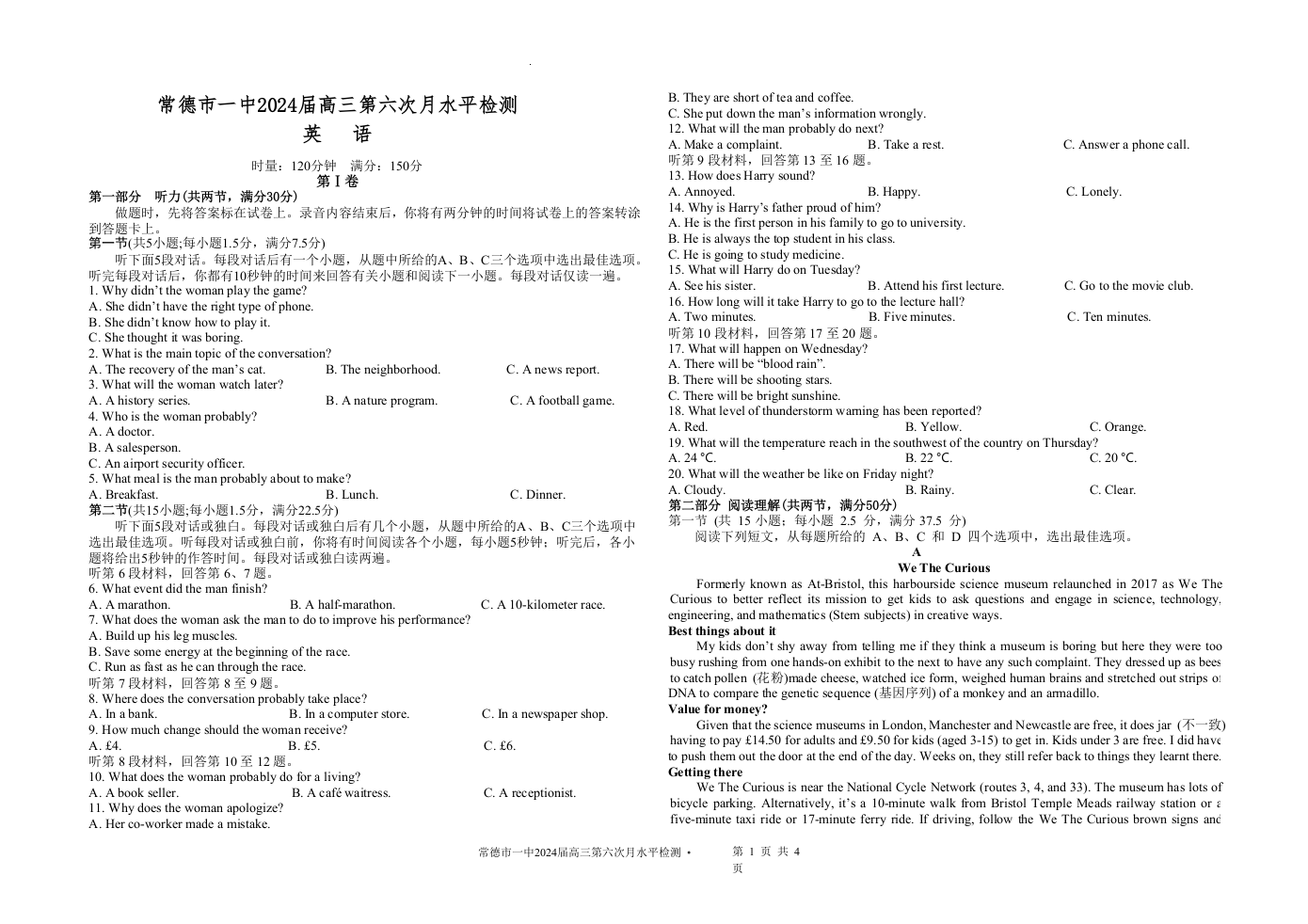 湖南省常德市第一中学2023-2024学年高三上学期第六次月考 英语