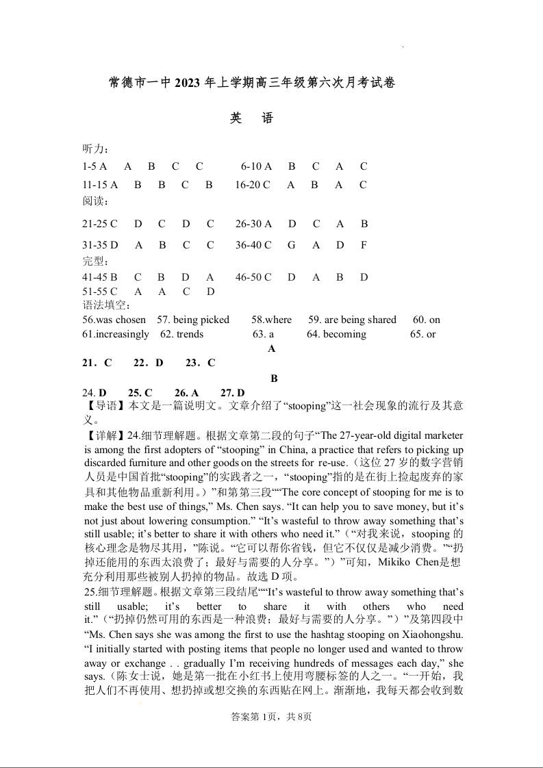 湖南省常德市第一中学2023-2024学年高三上学期第六次月考 英语答案