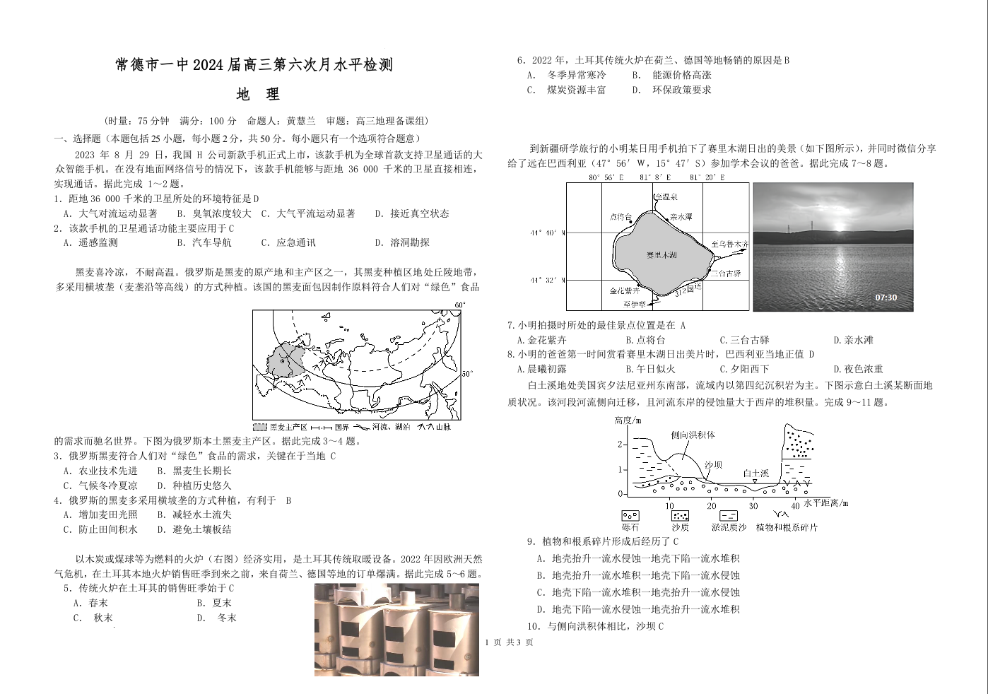 湖南省常德市第一中学2023-2024学年高三上学期第六次月考 地理