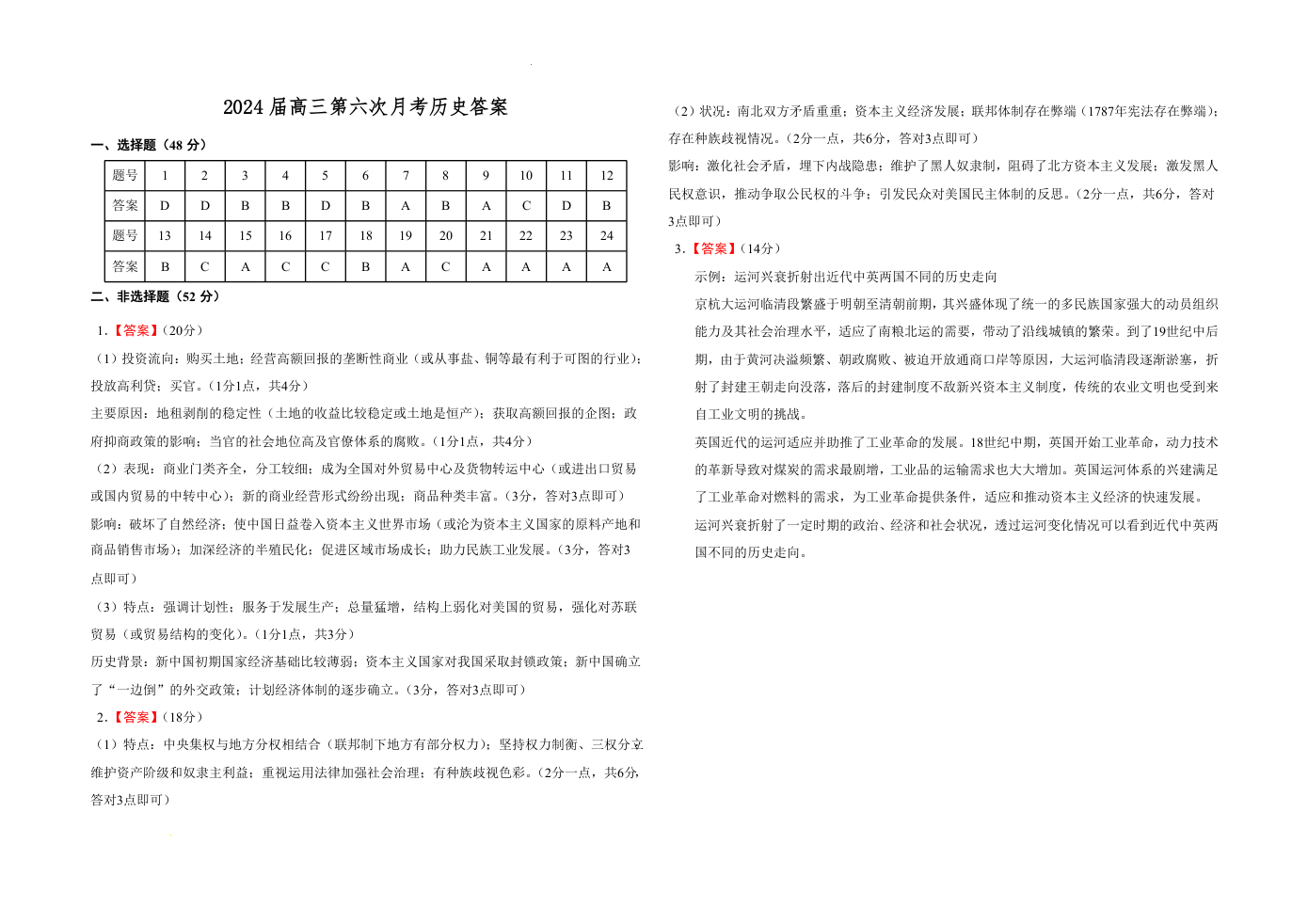 湖南省常德市第一中学2023-2024学年高三上学期第六次月考 历史答案