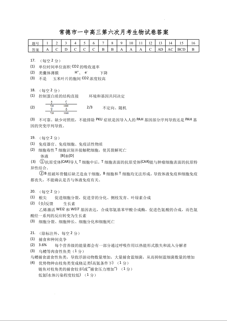 湖南省常德市第一中学2023-2024学年高三上学期第六次月考 生物答案